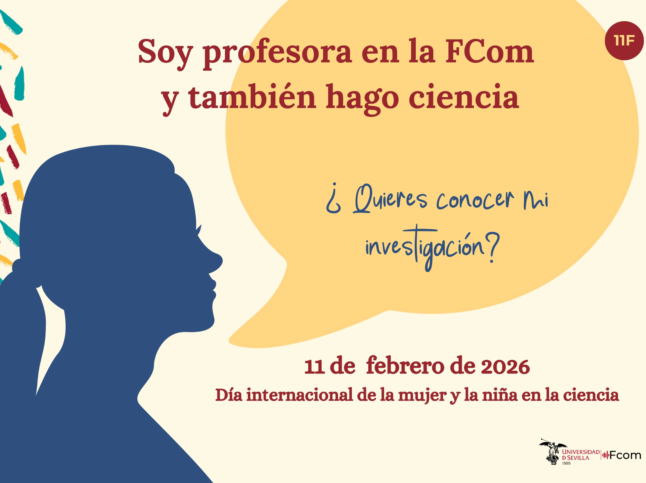 Además, a lo largo de esos días se lanzará la campaña "Soy profesora en la Fcom y también hago ciencia", centrada en dar a conocer la investigación que llevan a cabo las docentes de la FCom, poniendo el foco en sus proyectos, líneas de trabajo y aportaciones al ámbito académico. Con esta iniciativa, la Fcom se une a los actos organizados por la Universidad de Sevilla para visibilizar la labor de las investigadoras y fomentar las vocaciones científicas entre las alumnas.