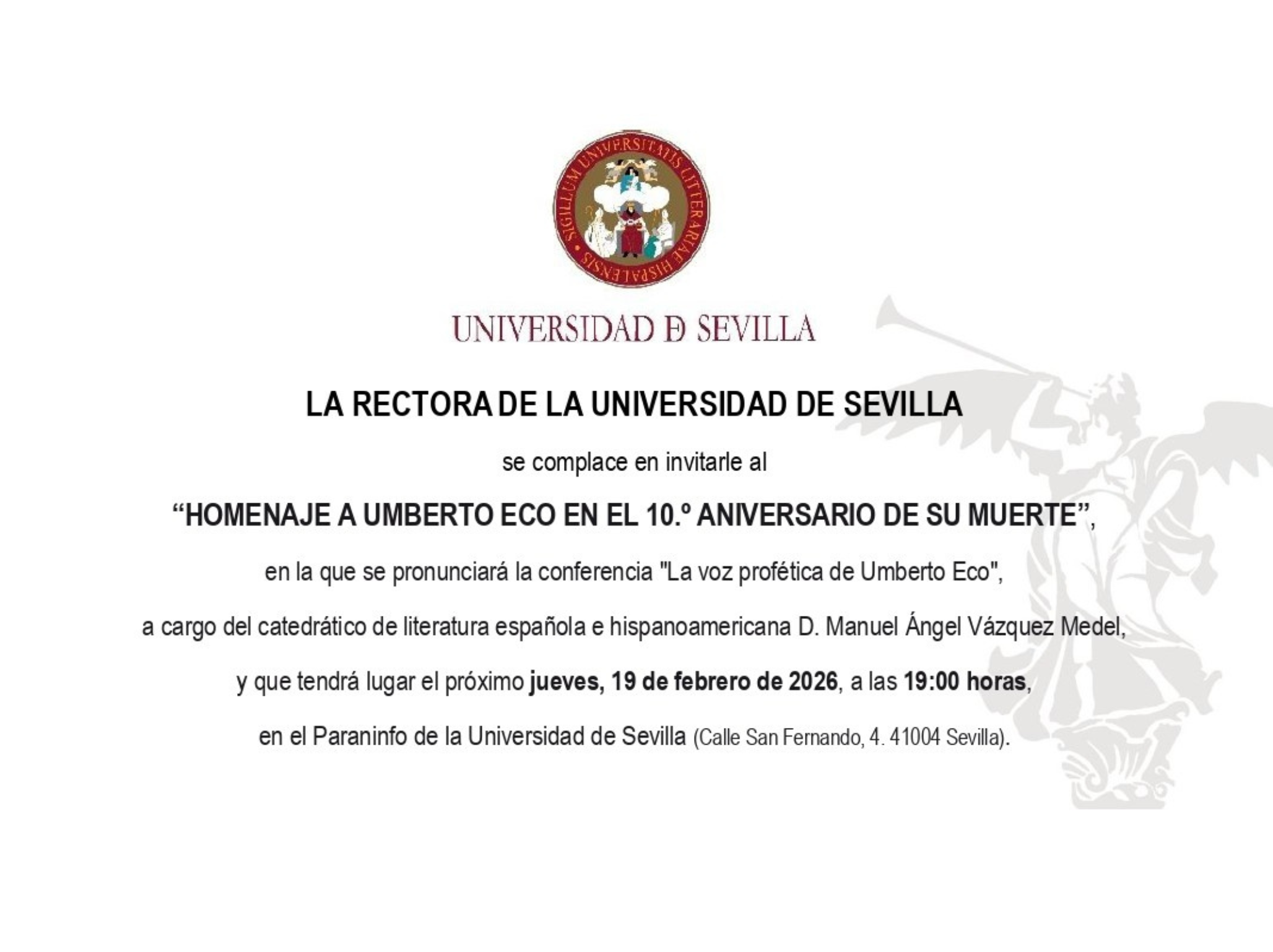 El evento estará presidido por la rectora de la Universidad de Sevilla y contará con la conferencia titulada “La voz profética de Umberto Eco”, que será impartida por el catedrático de Literatura Española e Hispanoamericana D. Manuel Ángel Vázquez Medel.