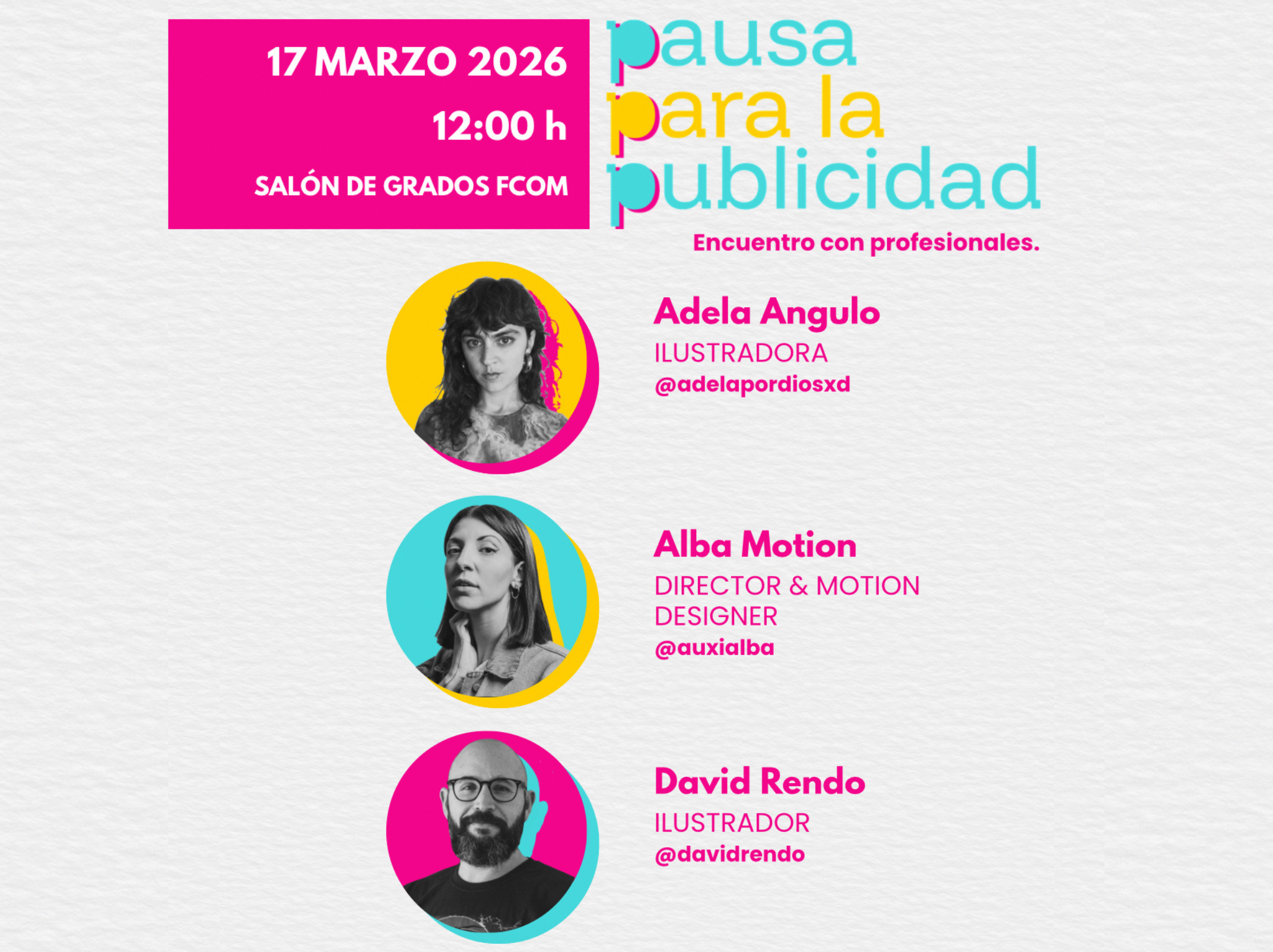 La sesión contará con la participación de Adela Angulo, Alba Motion y David Rendo, egresado de la propia facultad. Durante el encuentro, las personas invitadas compartirán con el estudiantado su trayectoria profesional, explicarán cómo desarrollan su proceso creativo y conversarán con el público en un formato cercano e informal.